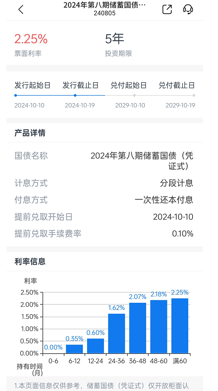例如2024年10月的凭证式储蓄国债,期限五年,票面利率2.25%,计息方式: