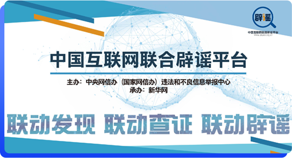 中国互联网联合辟谣平台由中央网信办 (国家网信办) 违法和不良信息举报中心主办,新华网承办,于2018年8月29日上线运行。平台依托于由 111 家单位组成的全国网络辟谣联动机制,实现谣言信息联动发现、联动查证和联动辟谣。