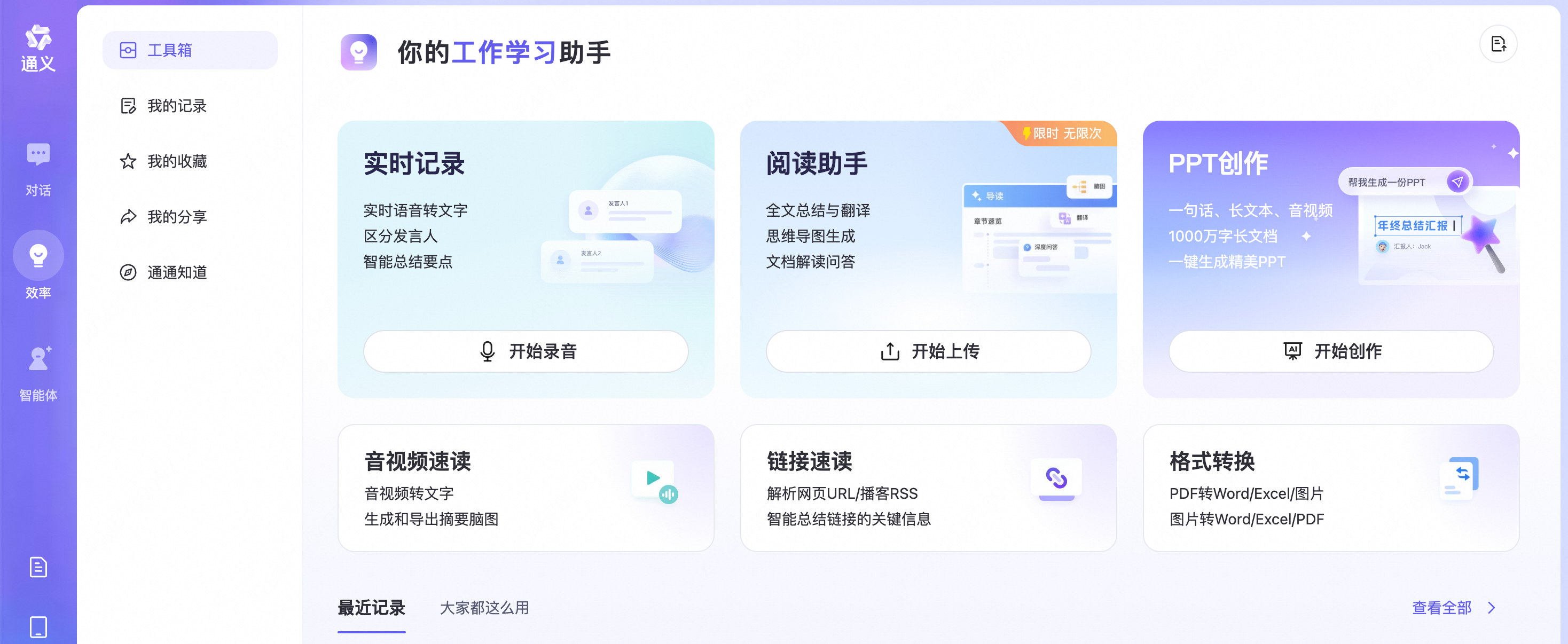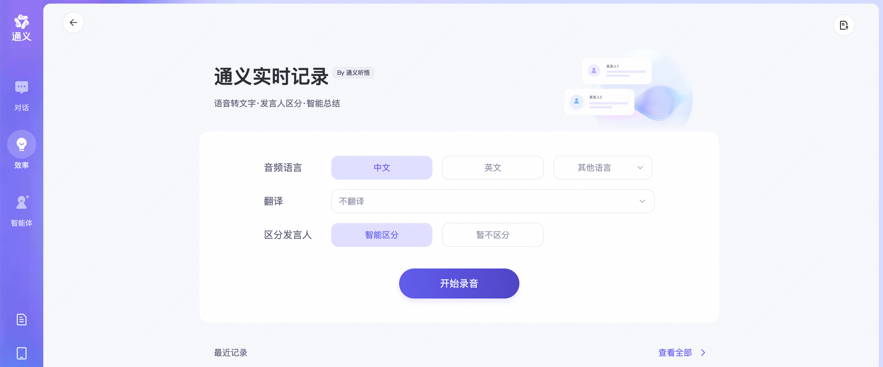 第一步:进入通义效率TAB(https://tongyi.aliyun.com/efficiency/home),点击开启实时记录