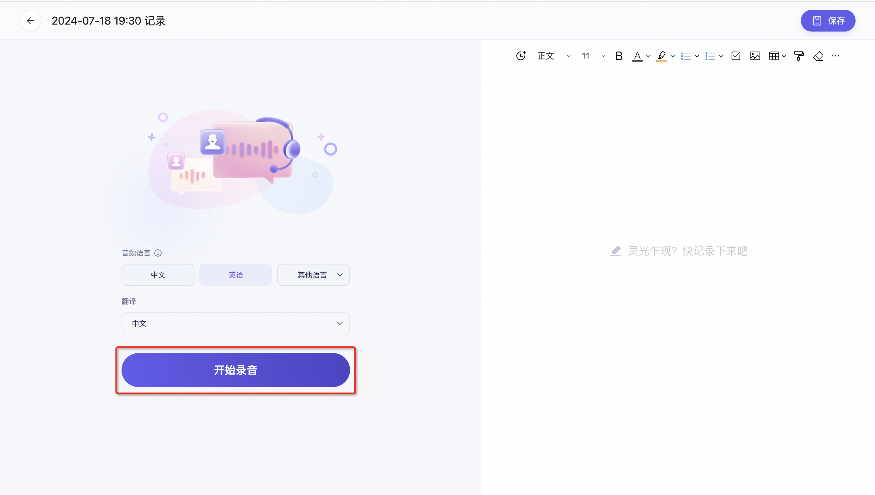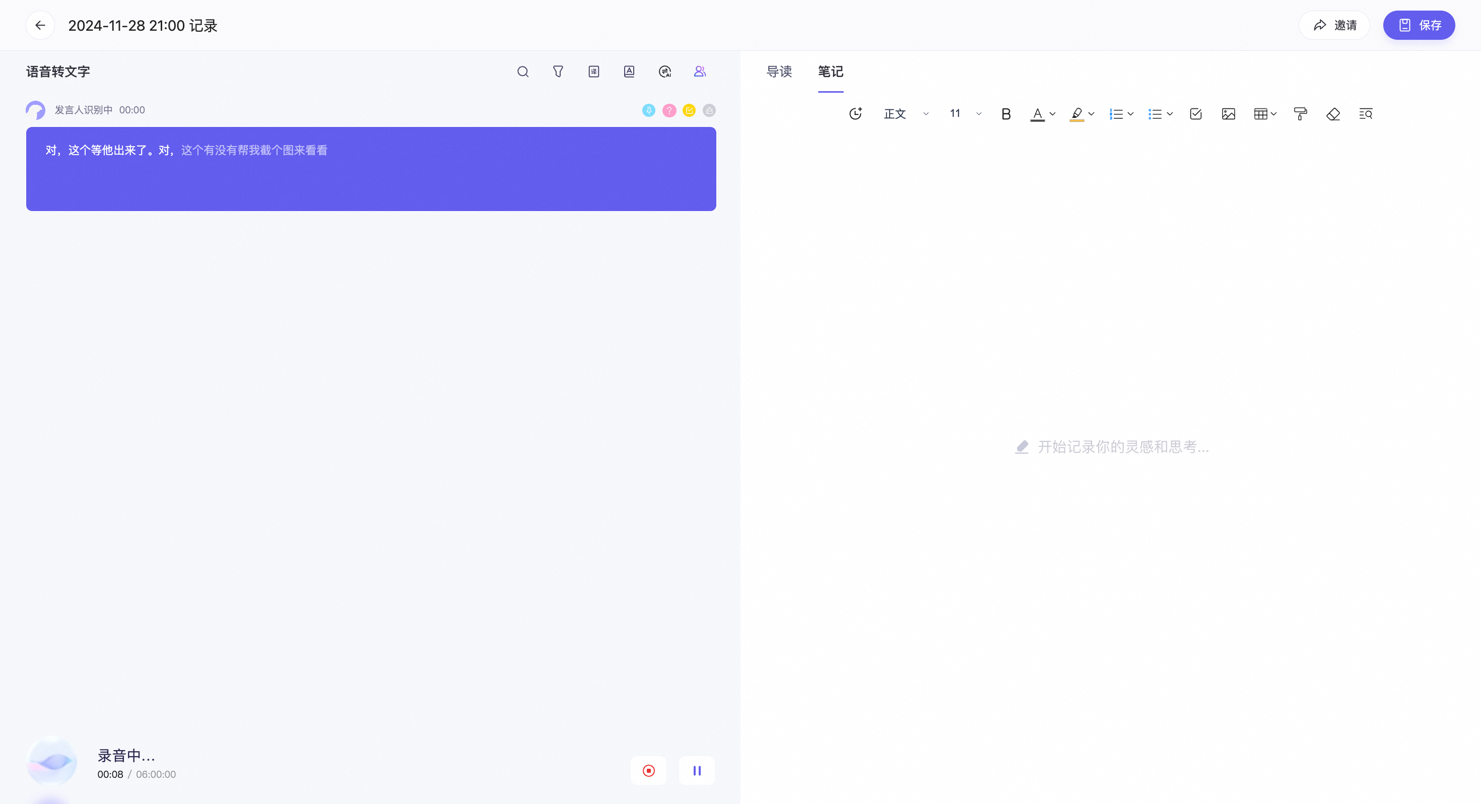 第三步:点击开始录音。录音过程中可以实时查看转写结果,也可以边听边记笔记。