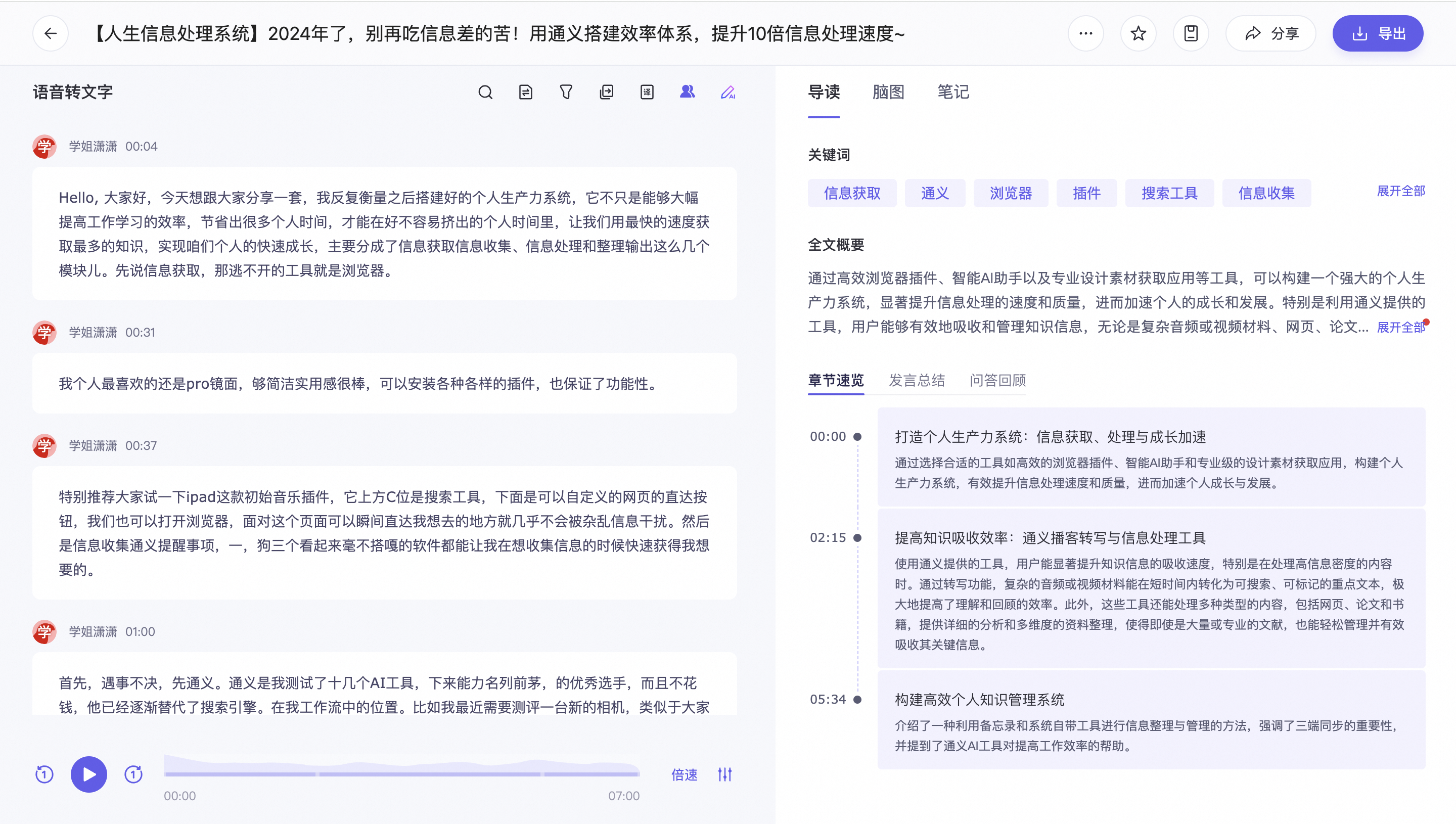 完成实时记录后,可以对转写的内容进行总结,生成AI导读思维导图,一键完成信息整理。