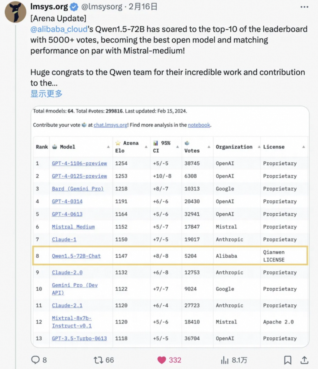 通义72B、110B开源模型都曾登顶Open LLM Leaderboard榜首。在开放研究机构LMSYS Org推出的基准测试平台Chatbot Arena上,通义72B模型多次进入“盲测”结果全球Top 10,创造了国产大模型的先例。长期沉淀的良好口碑为通义开源模型赢得一众铁粉,每有开源动作都会早早被开发者“蹲守”,也总能获得生态伙伴第一时间支持。