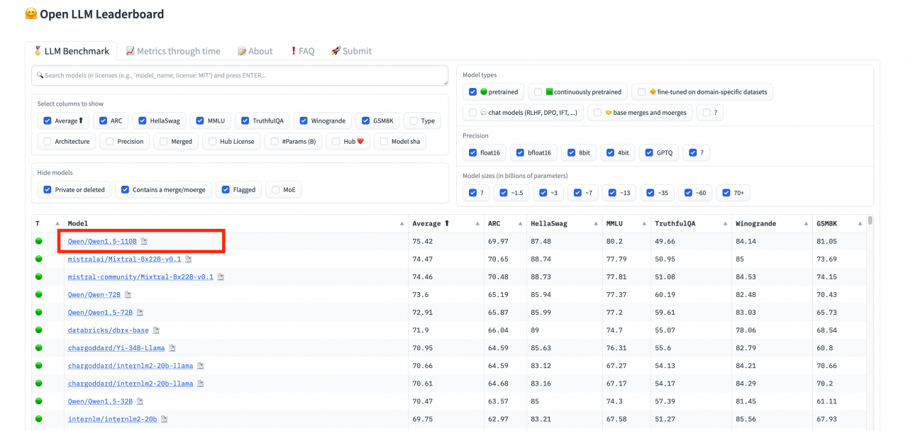 同时,通义发布1100亿参数开源模型Qwen1.5-110B,该模型在MMLU、TheoremQA、GPQA等基准测评中超越了Meta的Llama-3-70B模型;在HuggingFace推出的开源大模型排行榜Open LLM Leaderboard上,Qwen1.5-110B冲上榜首,再度证明通义开源系列业界最强的竞争力。