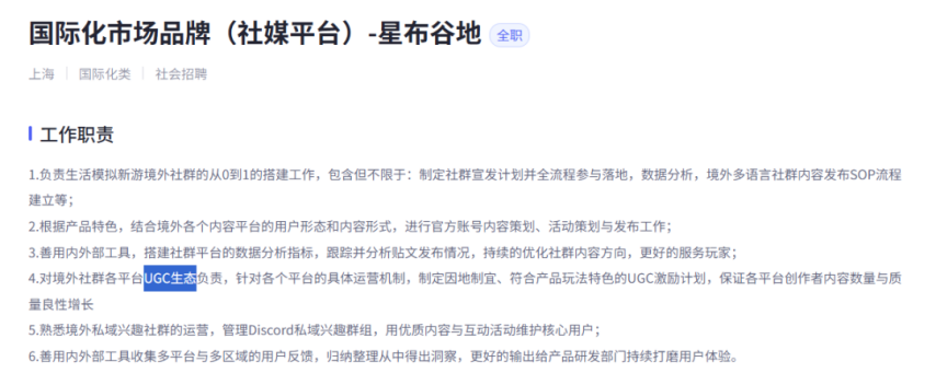 《原神》在去年就已开启了UGC玩法的相关招聘,包括UGC系统策划、UGC关卡策划、UGC战斗策划等岗位。目前在米哈游官网招聘岗位中可以查询到超过10个UGC相关的岗位,而这些岗位不仅限于《原神》项目,比如在《星布谷地》多个岗位中也有UGC相关的关键词。