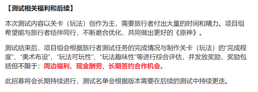 公告中还表示在测试结束后将为参与测试的玩家发放周边福利、现金酬劳、长期签约合作机会等奖励。