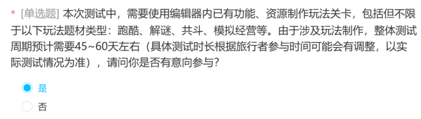 个人形式报名的调查问卷中显示玩法题材类型包括跑酷、解谜、共斗和模拟经营等,测试时长为45-60天,并且在问卷中向玩家了解编程相关的开发经验。