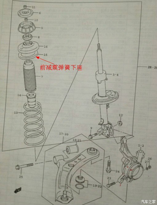 这个就是前悬挂分解图,大家感觉悬挂松散的就更换限位垫就可以了(编号:6),可以用原厂的也可以用本贴说的飞度的,用飞度的限位垫的话就在编号6与编号10之间加个2毫米的垫片,换回原厂件不用垫垫片(但是改善不大)。至于大家经常怀疑造成问题的顶胶(编号5)和平面轴承(编号8)其实根本不用换,质量很好。另外如果避震漏油需要更换新的原厂件避震的话,原厂避震本身就带有顶胶的了。在装好限位垫后紧固(编号11)的螺母时,最好用扭力扳手调到50牛米紧固即可,不能拧得死紧死紧的,会造成安装部位没有摆动空间而产生应力造成变形。