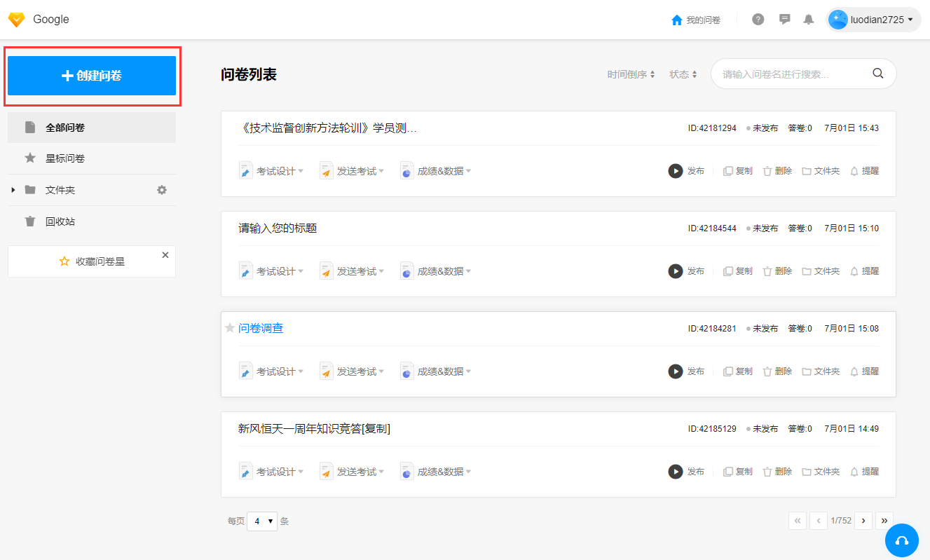 步骤一:点击”创建问卷“,选择创建的问卷类型;
