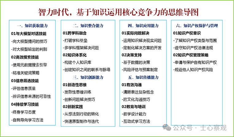 2.知识的类型,已从单纯的传统学科知识扩展为整合的非传统形态的知识和技能。除了传统的学科专业知识外,跨领域的知识整合、实践经验的积累以及软技能(如沟通能力、领导力、团队协作能力等)的培养也变得越来越重要。这些非传统形式的知识在智力时代同样具有不可替代的价值。