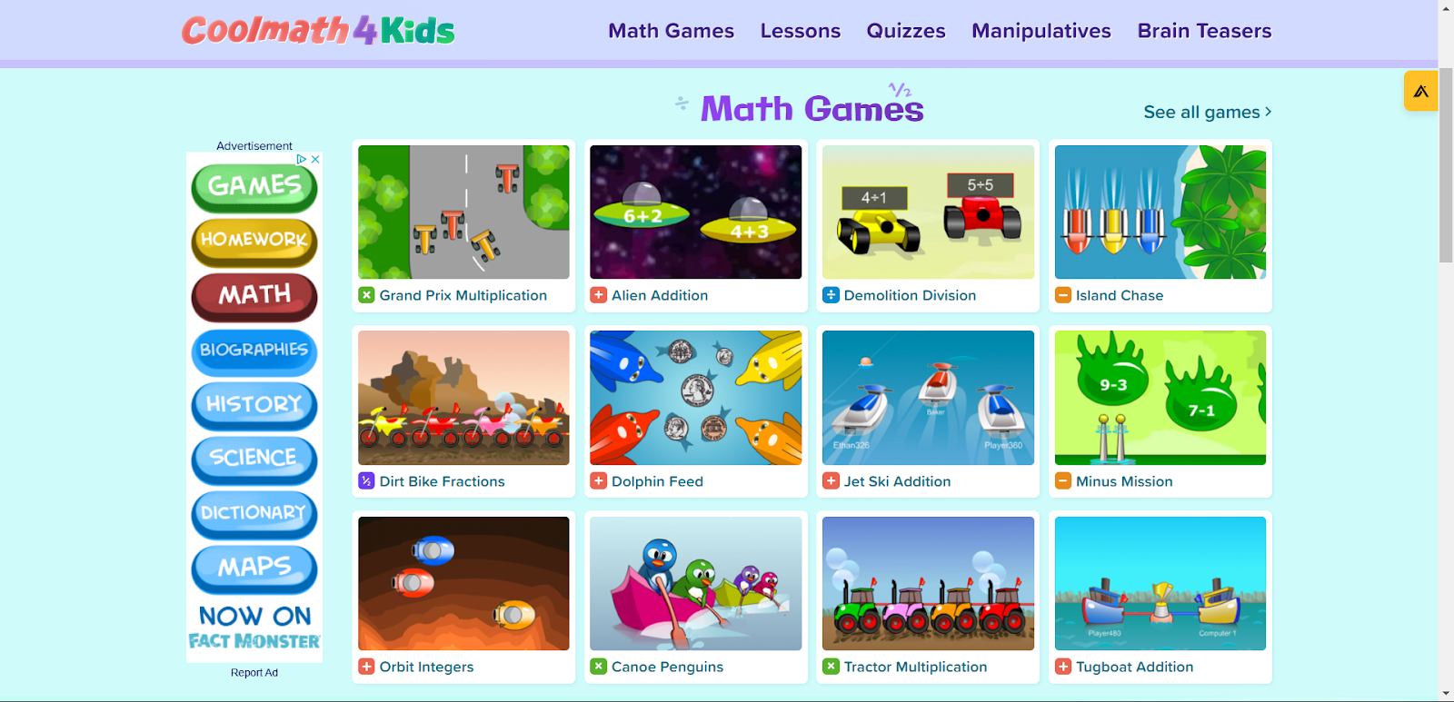 对于年龄较小的学习者来说,这是一个更适合儿童使用的平台版本、 CoolMath4Kids可供选择。该版本侧重于基础算术、分数和乘法,提供引人入胜的课程和简单的互动游戏,以易于理解的方式介绍基础数学概念。