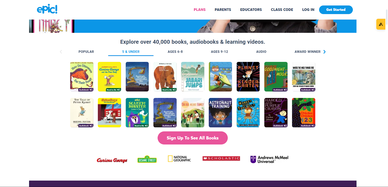 Epic!是一个数字图书馆,有 40,000 多本儿童读物、有声读物和视频。 该平台提供虚构和非虚构图书、教育视频和 “我读 “故事,对于爱书的孩子来说,是传统图书馆的绝佳替代品。教师可以为学生创建自定义阅读清单,跟踪进度,并为课堂学习分配书籍。