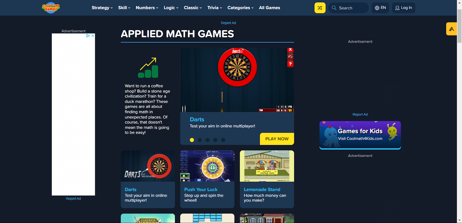 为了方便孩子们找到符合他们兴趣的游戏,网站分为不同的部分,包括侧重于规划和决策的 “战略“(Strategy)、以快节奏游戏为特色的 “技能”(Skill)和通过有趣的挑战强化算术技能的 “数字”(Numbers)。此外,还有一个逻辑版块,提供烧脑谜题;一个经典版块,提供复古风格的游戏;一个琐事版块,提供基于知识的游戏。为了方便浏览,用户可以探索类别来查找特定类型的游戏,或者查看所有游戏来查看全部游戏。