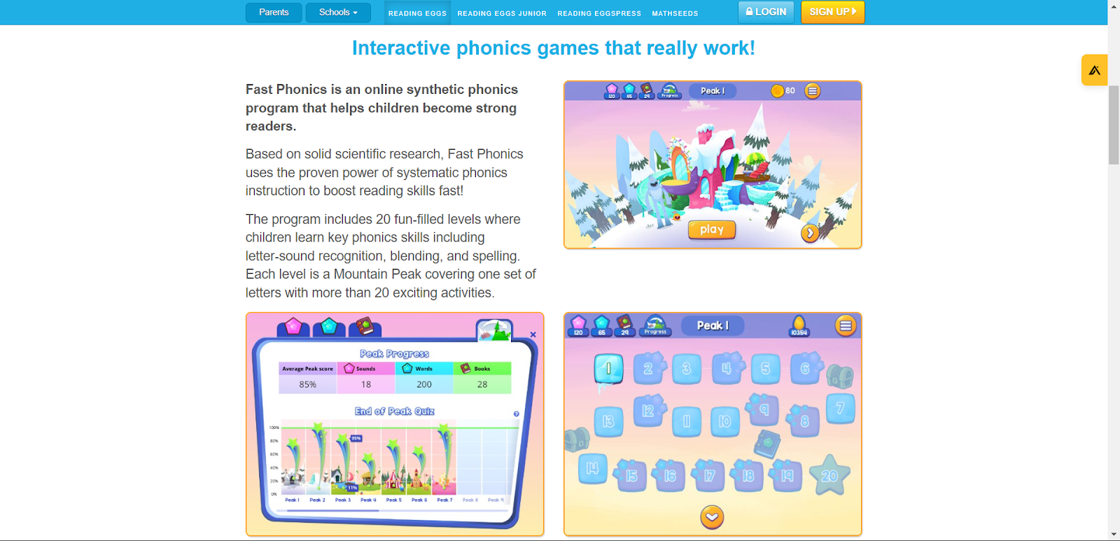 Reading Eggs是一项基于语音的阅读计划,旨在通过互动游戏、歌曲和故事书帮助儿童学习阅读。该平台可根据每个孩子的学习水平进行调整,从字母识别、音位认知到流利性和理解能力,循序渐进。除了识字,Reading Eggs 还提供名为 Mathseeds 的数学课程,是一个全面的早期学习平台。