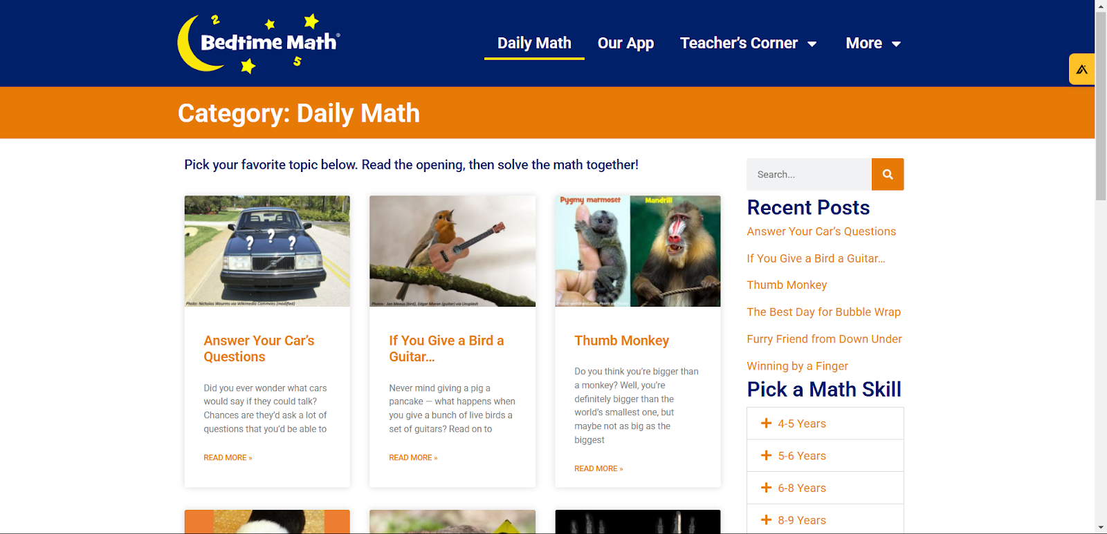 睡前数学》通过为孩子们提供有趣的、基于故事的数学问题,让孩子们在睡前解决这些问题,从而使数学学习成为孩子们日常生活的一部分。该应用程序和网站提供引人入胜的真实世界数学挑战,旨在与父母一起完成,鼓励家庭式学习。