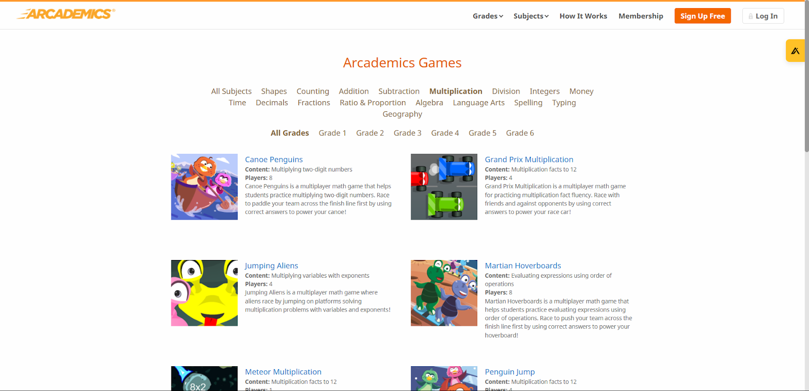 Arcademics提供多人数学和语言艺术游戏,学生可以与同学竞争,也可以单人玩,以提高自己的技能。这些快节奏的街机式游戏有助于巩固加法、减法、乘法、除法和分数,同时营造一个有趣的竞争性学习环境。