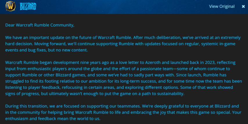 暴雪原文是:“经过深思熟虑,我们做出了一个极其艰难的决定。展望未来,我们将继续支持魔兽大作战,更新侧重于定期、系统性的游戏内事件和错误修复,但不会提供新内容。”