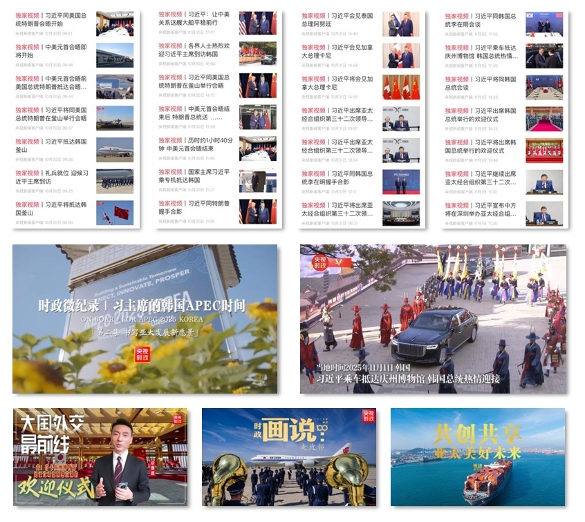 全景呈现亮点!《推动亚太合作,习近平如此阐释》《习近平:期待各方共赴深圳之约》53条时政快讯、独家视频全网首发,第一时间传递习近平主席“越是风高浪急,越要同舟共济”“合作共赢才是越走越宽的人间正道”等重大倡议主张。30篇时政稿件获全网置顶。《习近平乘车抵达庆州博物馆 韩国总统热情迎接》《“到邻居家串串门 看看朋友”时隔11年习主席再访韩国》《走!见证一场氛围感拉满的欢迎仪式》等产品,突出韩方以高规格礼遇迎接习主席到访的生动细节,展现韩国领导人和当地民众对习主席的热烈欢迎和崇高敬意。时政微纪录《习主席的韩国APEC时间》、重磅微视频《共创共享亚太美好未来》、视频产品《大国外交最前线》等,全方位、立体式展现习主席此访成果丰硕、亮点纷呈。
