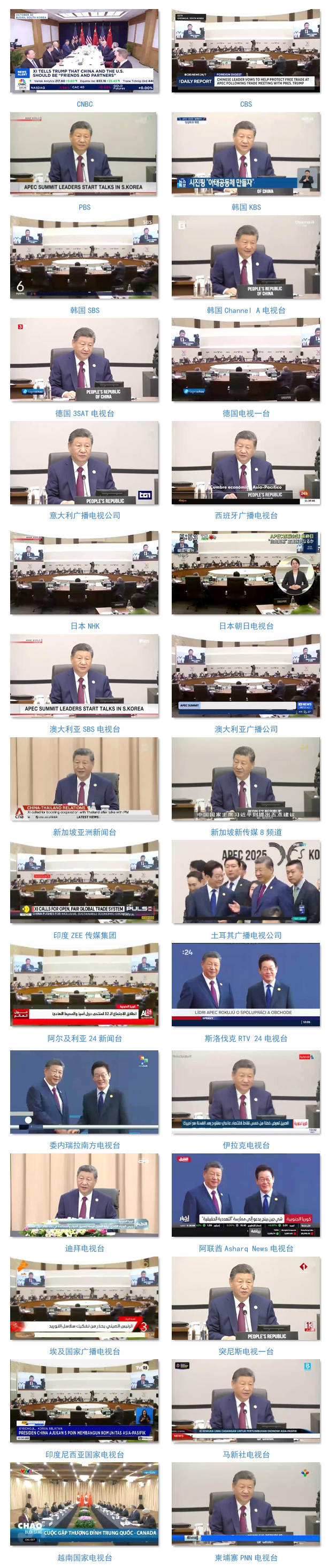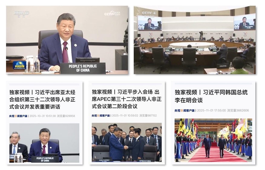 全程时效领先!此访期间,习近平主席出席APEC会议并发表重要讲话,与美国总统举行会晤,会见加拿大、泰国、日本、韩国等多国领导人,系列双多边活动丰富密集。央视新闻新媒体、CGTN推出直播特别节目,全球首发《习近平出席亚太经合组织第三十二次领导人非正式会议并发表重要讲话》《习近平在亚太经合组织第三十二次领导人非正式会议第二阶段会议上的讲话》《习近平同美国总统特朗普在釜山举行会晤》《习近平出席韩国总统举行的欢迎仪式》《习近平同韩国总统李在明会谈》等重要消息,同步向海内外呈现元首外交重要时刻。新闻频道、中文国际频道、中国之声、环球资讯广播、大湾区之声等多平台持续跟进,推出《直击APEC》《APEC进行时》等报道。央视新闻发起的#习主席访问韩国#、#APEC2025#、#共建普惠包容的开放型亚太经济#20余个微博话题登上热搜,总阅读量超7.4亿