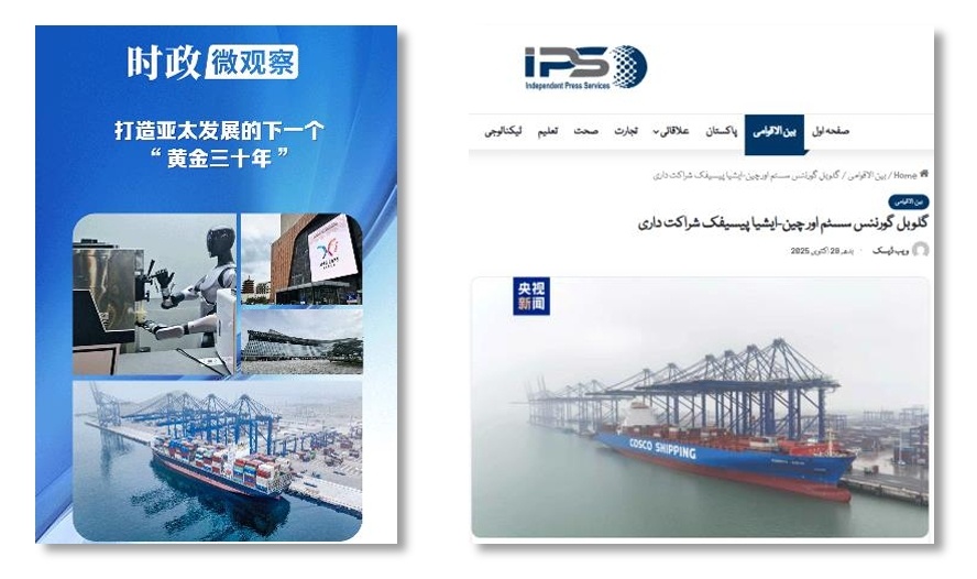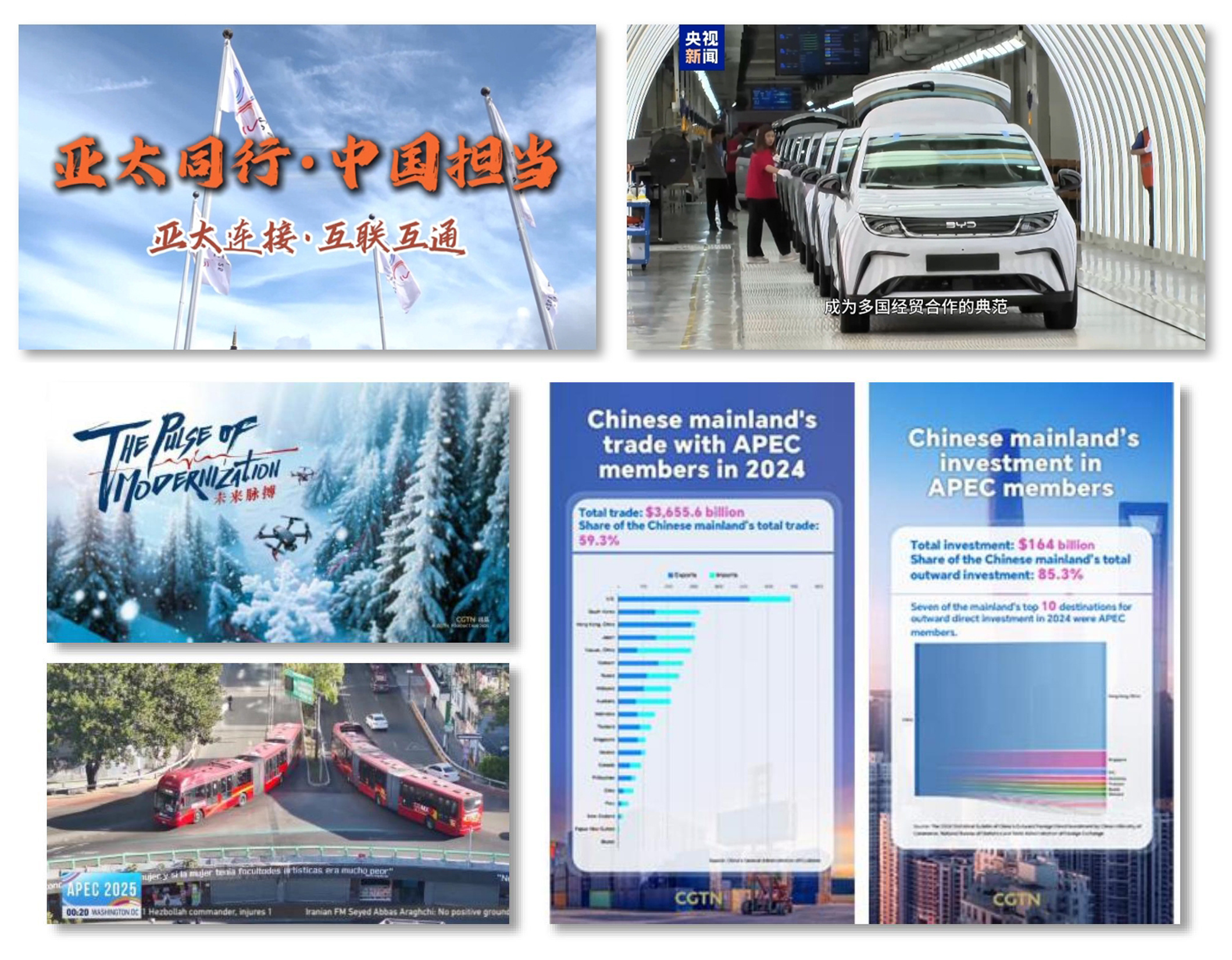 亚太合作繁荣之路——“国际锐评”“时政新闻眼”“主播说联播”“先声夺人”等栏目推出《如何推动亚太开放合作,习近平提出这些重要主张》《APEC“中国年”即将开启 引领亚太共同体开新局》《同心协力,共筑亚太命运共同体》等系列评论,深入阐释习近平主席重要讲话精神,有力释放中方顺应时代大势、同各方携手构建亚太共同体的鲜明信号。系列报道《亚太同行》《中国为亚太区域合作注入新动能》展现中国理念与实践在亚太合作中日益凸显引领力、感召力,彰显大国担当。CGTN系列特稿《APEC的中国声音》美国、英国、加拿大、澳大利亚、法国93个国家和地区的1221家海外主流媒体转载转发。
