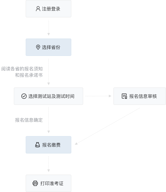 2、报名流程:打开普通话在线报名网站 →点击“我要报名”→选择城市/机构(测试站以及考试时间)→点击“下一步”→阅读报名须知 →填写报名信息 →点击“下一步”→提交报名信息 →在线缴费/现场缴费(具体看测试站缴费要求)。