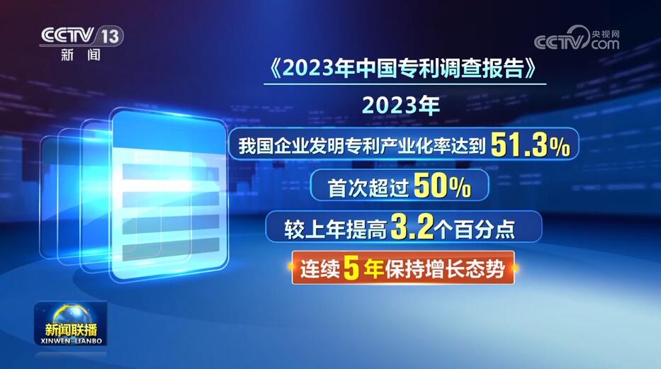 记者从国家知识产权局了解到,目前,我国国内有效发明专利中,企业所占比重已超过七成,数量超过300万件。企业是科技创新和产业创新的重要力量,也是专利产出和转化的主体。国家知识产权局最新的《2023年中国专利调查报告》显示,2023年,我国企业发明专利产业化率达到51.3%,首次超过50%,较上年提高3.2个百分点,连续5年保持增长态势。我国企业用于自主品牌产品的发明专利产业化平均收益是用于代加工产品的发明专利产业化平均收益的两倍多,专利与品牌综合运用效益更加突出。