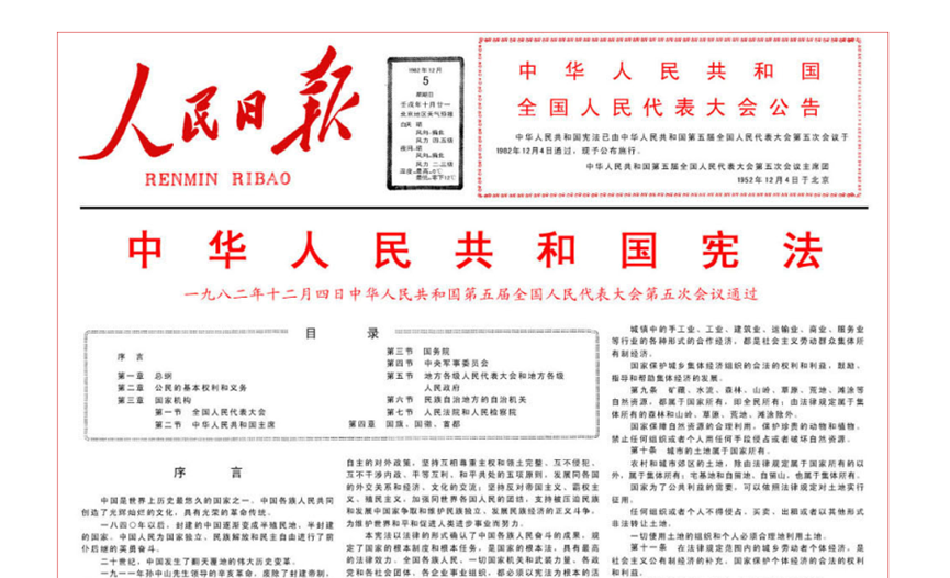 1982年12月4日第五届全国人大五次会议通过并公布施行经全面修改后的《中华人民共和国宪法》。图源:人民日报图文数据库