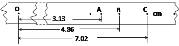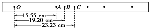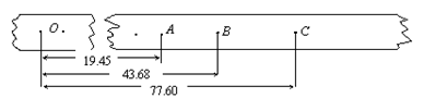 在下落过程中,打点计时器在纸带上打出一系列的点。在纸带上选取三个相邻计数点A、B和C,相邻计数点时间间隔为0.10s,O为重锤开始下落时记录的点,各计数点到O点的距离如图7所示,长度单位是cm,当地重力加速度g为9.80m/s2。