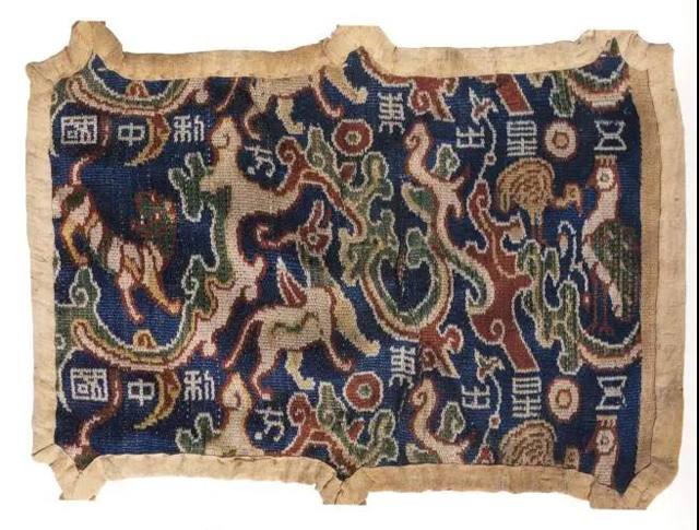 五星出东方利中国锦护臂(图2)出自新疆尼雅墓地(M8:15),长18.5cm,宽12.5cm 带长21.0cm,另有“诛南羌”锦残片(M8:41)一片。此锦图案总体采用山状云作骨架,沿织锦纬向连续铺展。自右边起依次有两鸟、独角兽和虎,并伴以铭文五星出东方利中国,在铭文旁还有两个圆点纹代表五星中的两星。在工艺上,此锦采用1:4平纹经重组织,整个图案不分色区,均以蓝、绿、红、黄、白五色织出,五星的图案也恰好由这五种色彩表示。经密220根/cm,纬密24根/cm,图案经向循环有84根夹纬,7.4cm,远远大于普通的汉魏织锦,因此,它是汉式织锦最高技术的代表。