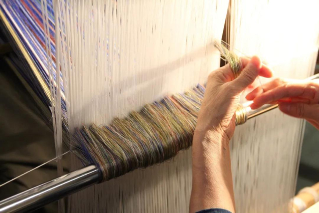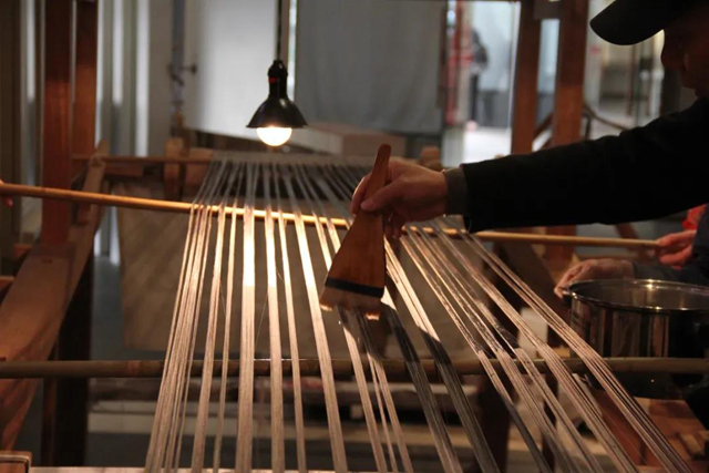 采用分耙手工整经,利用掌扇提高效率,整经方法与明代宋应星《天工开物》中描述的一致,耙距6m,4个来回,整经长度24 m,上架筒子数:8个。