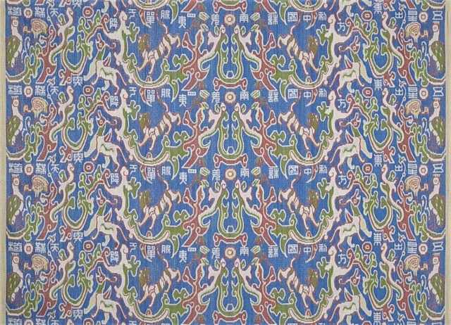 (3)织物花纹与地组织的结构相同,图案靠经线的不同色彩来显现。织造时,由两色或两色以上不同颜色的经线为一付,与交织纬成平纹或斜纹交织。经线依其作用可分为表经和里经两部分,锦面上显色的表经有较长浮线,遮盖着下层里经的浮点,使其不露出表面。为了用不同颜色的经线显示花纹,同一根经线有时起表经的作用,浮在上层,有时起里经的作用,沉于下层。