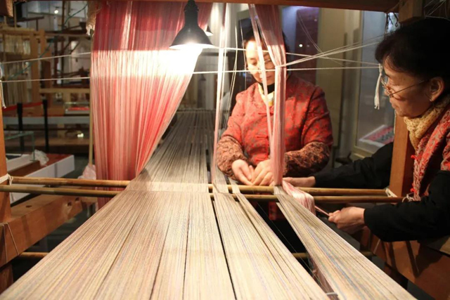 纬:蚕茧→缫丝→练丝→染丝→络筒→卷纬。