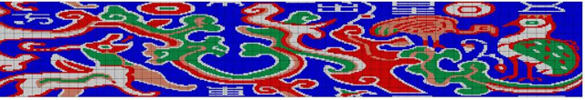 (5)为取得更丰富的色彩效果,常采用分区换色的方法,不同的区域使用不用颜色的经线,这是古代经锦工艺中常用的一种技法。