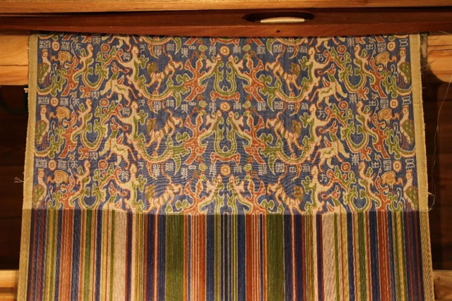 织机采用滑框型多综提花织机,织造操作由一人完成,一人辅助。织造之时,织工有两根地综踏杆,84片提花综可以选择。他先踏下地综踏杆1,提起地综2,织入第1纬,再移动选综直梁,把勾移到提花综1处,踏下中轴,则抬起滑框,提起提花综1,织入第2纬。然后,织工再踏下地综踏杆2,提起地综1,织入第3纬,形成平纹。再移动选综直梁,把勾称到提花综2处,踏下中轴,提起提花综2,织入第4纬。此后,地综一直是两片之间更换,而提花综则在1-84,此后可以继续是1-84,或84-1。但从当时的情况来看,前一种的可能性更大些。复制品见下图(图11-12)。
