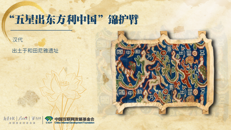 有趣的是,新疆和田尼雅遗址出土的一件文物上,也织有“五星出东方利中国”八个篆体汉字。