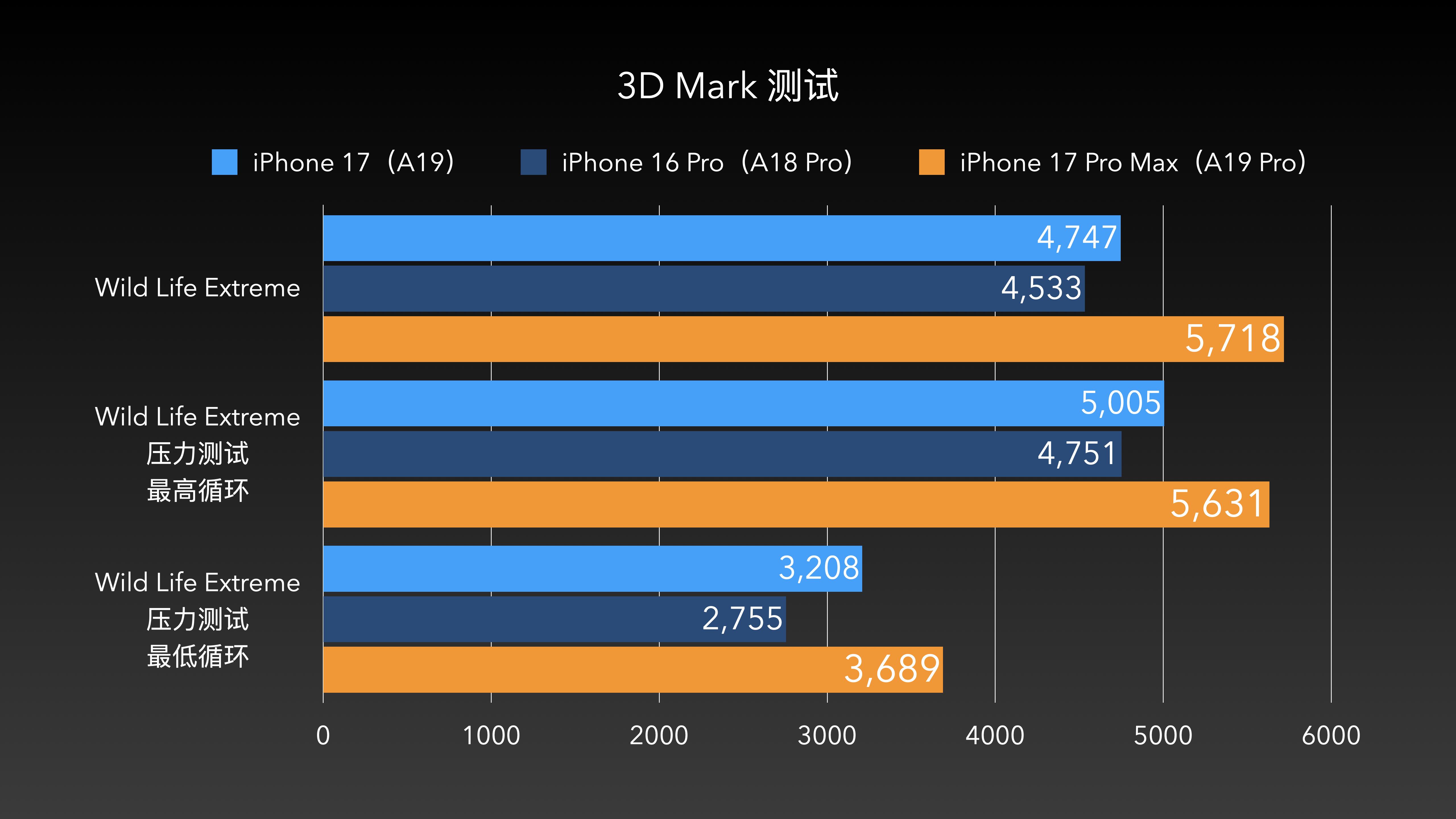 在更贴近游戏测试的 3D Mark 测试中,iPhone 17 的 Wild Life Extreme 测试成绩较 iPhone 16 Pro 有 4% 的提升。我知道,4% 的差距看起来并不大,但不要忘记,芯片的性能提升只是决定手机游戏性能的其中一个因素,手机芯片的功耗、发热同样会影响最终的游戏表现。