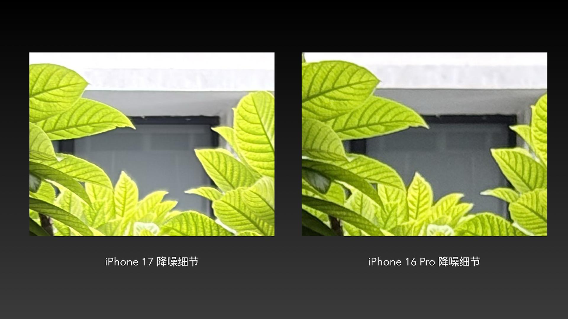 另外,iPhone 17 的 AI 介入也更加积极,有些地方用 iPhone 16 Pro 拍照会出现噪点和纹理细节,但 iPhone 17 选择直接用 AI 全部抹平。