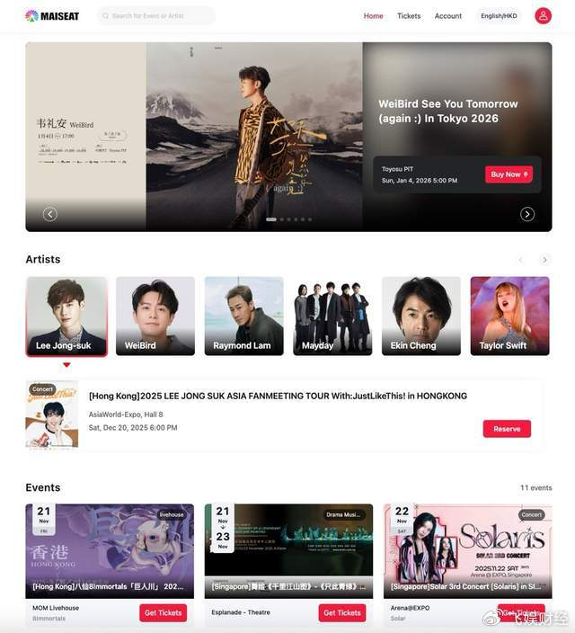 在网上搜索“大麦国际”或“MAISEAT”,即可进入大麦国际官网。可以看到,目前大麦国际已经上线上杉升《直到世界尽头》中国香港站演唱会、韦礼安《如果可以,我想和你明天再见again》日本东京站演唱会、Mamamoo女团成员Solar《Solar 3rd Concert [Solaris]》 新加坡站演唱会、岳云鹏孙越《四海福临2025相声专场》马来西亚吉隆坡站等十余场演出活动。