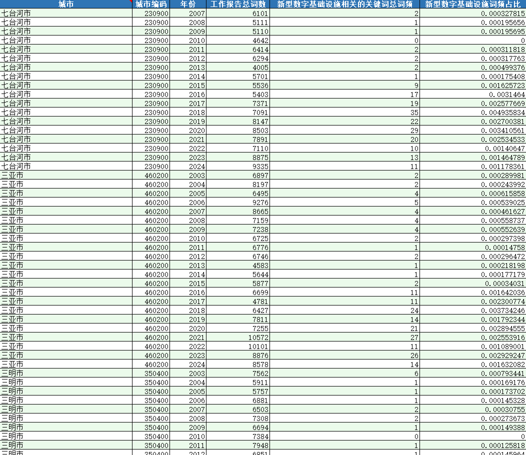 城市 城市编码 年份 工作报告总词数 新型数字基础设施相关的关键词总词频