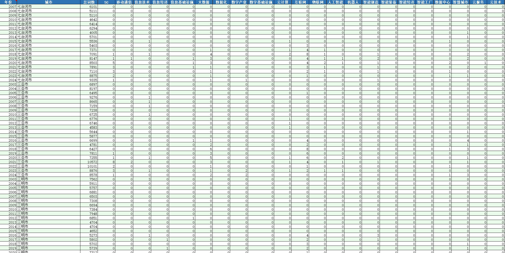 中国地级市数字基础设施发展水平数据集(2003-2024)新型数字基础设施,如5G网络、人工智能、工业互联网和物联网,是驱动现代经济社会转型的核心力量。本数据集全面收录了2003年至2024年中国285个地级市在数字基础设施领域的发展水平数据。数据源自各城市政府发布的年度工作报告,通过先进的文本分析技术,对报告进行分词处理,统计了51个数字基础设施相关词汇的出现频次,包括5G、移动通信、信息技术等,并计算了这些词汇在总词汇中的占比,以此作为衡量数字基础设施发展水平的指标。数据集包含超过5700条记录,以Excel格式提供,为研究人员、政策制定者和企业提供了宝贵的资源,用于分析城市数字化进程、评估政策效果和进行区域比较。该数据覆盖时间长、范围广,确保了分析的全面性和连续性,对于理解中国数字化转型的动态和趋势具有重要意义。