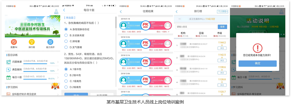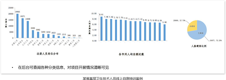 面对社区医生、乡镇卫生院基层医生,与省卫健委基层处共同组织,统一搭建基层卫生人员服务能力在线培训考核的平台 ,医生自行注册进行初步考核,平台采用学员人脸识别确认身份功能,确保人员信息真实性,根据考核结果针对性开发线上培训课程。