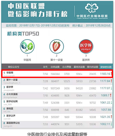 华医网站与微信平台的访问量及影响力在行业内处于领先地位!华医微信公众平台目前关注人数超过 488 万 ,周阅读量超过 144 万 !在诸如《中国医联盟微信影响力排行榜》等行业权威榜单中排行名列前茅!