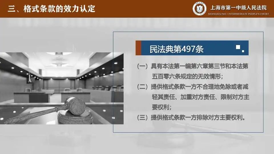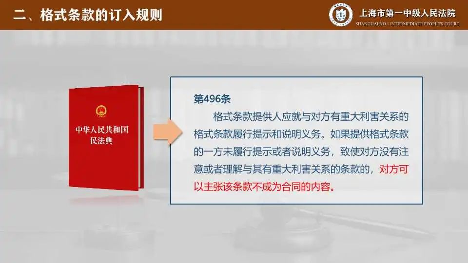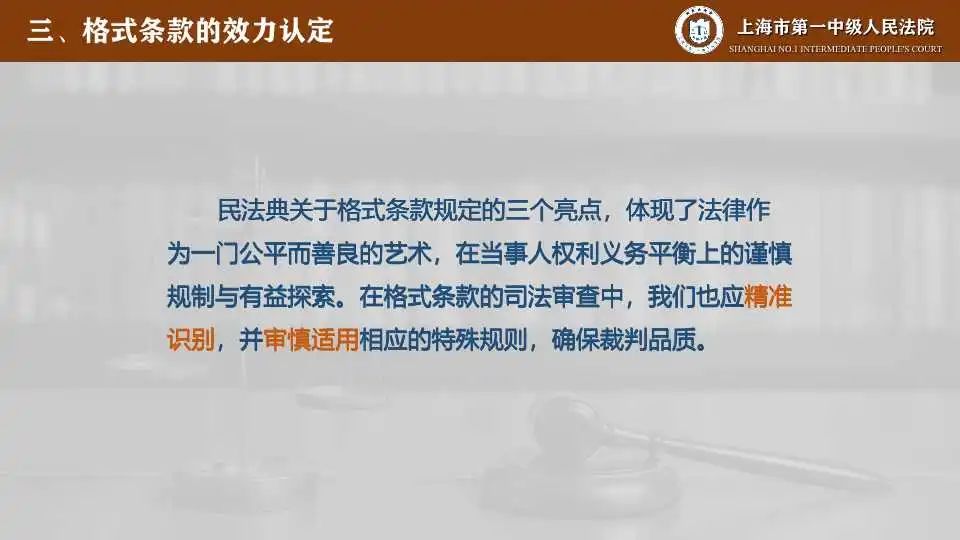 好的,以上就是今天想和大家分享的全部内容。《民法典》关于格式条款规定的三个亮点,体现了法律作为一门公平而善良的艺术,在当事人权利义务平衡上的谨慎规制与有益探索。在格式条款的司法审查中,我们也应精准识别,并审慎适用相应的特殊规则,确保裁判品质。