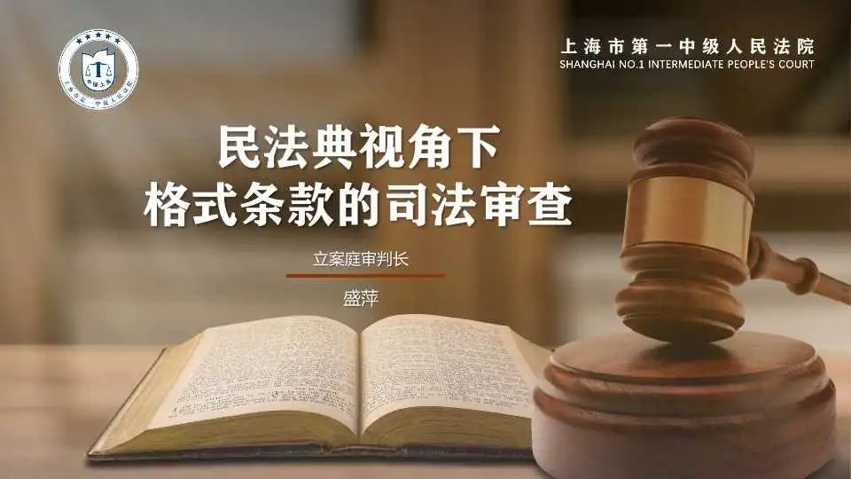 大家好。我是上海市第一中级人民法院的盛萍。今天和大家交流的主题是,民法典视角下格式条款的司法审查。