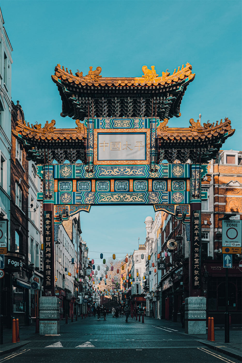 伦敦的唐人街不大,由一条大街和几条横街组成,距离白金汉宫和唐宁街10号首相府都不远。沿着唐宁街继续向前,200米不到,穿过著名的鸽子广场(特拉法加广场),路过国家画廊就到了。这里有标准的中式牌楼和汉风唐韵式的商亭。长约800米的主街两边各伫立着一个牌楼,上面写着"国泰民安"和"伦敦华阜"。街道两边的餐馆、商场、药店等都挂着显眼的汉字。由于语言和历史的原因,唐人街成了一个独立于英国社会的文化孤岛。现在的唐人街涵盖了华人生活各个方面的行业,如华人社区,食品超市、银行、旅行社、律师楼、会计师楼、图书馆等。伦敦的唐人街虽然不大,但很精致,像一碟材料简洁的菜肴,味道全在那一条主街和几条纵横交错的辅街里。