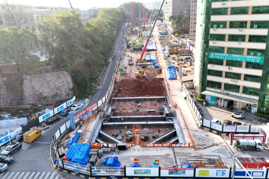 该车站位于既有5号线长岭陂站东侧,为地下三层岛式车站,采用明挖顺作法施工,车站施工面临场地狭小、周边管线密集、既有消防站拆迁等困难,对此,项目建设团队凝心聚力破解难题——