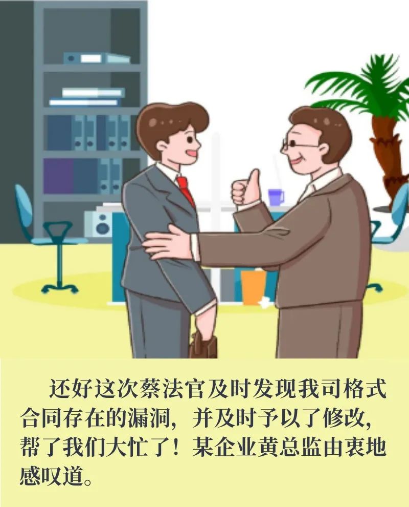 今年3月份,枫亭法庭蔡法官在协助该企业排查矛盾纠纷及经营风险时,发现该企业正与外地一企业产生纠纷,根源就在于双方在签订的合同时,对货物交付方式约定不明,继而产生分歧,并可能由此产生巨额违约金,双方合作一度陷入僵局。蔡法官了解后第一时间帮助该企业与外地企业取得联系,从专业的角度进行分析,提出了专业的法律意见,促使双方对格式合同的个别条款进行修改,双方皆大欢喜,合同继续履行。一场可能引发诉讼的纠纷化解于无形,切实实现了为企业排忧解难的初衷。