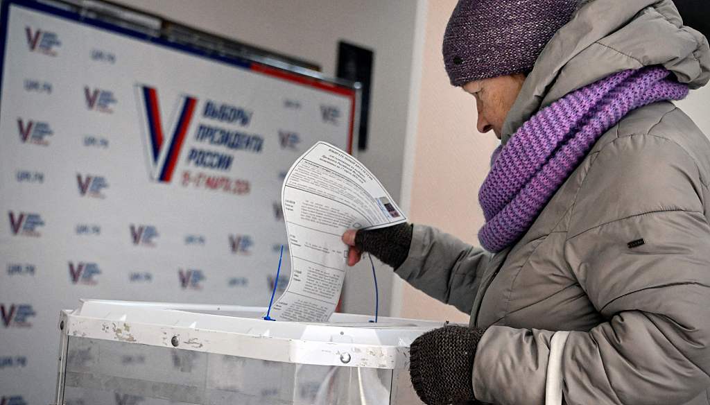当地时间2024年3月15日,俄罗斯莫斯科,2024年俄罗斯总统选举期间,选民在投票站投票。