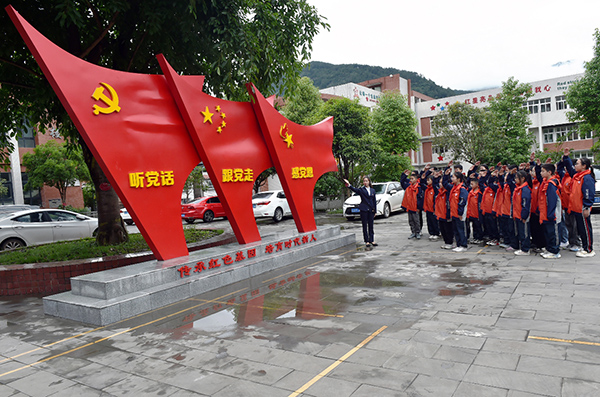 2023年5月26日,重庆,老师带领学生在校园里熟悉党旗、国旗、队旗,进行爱国主义教育。来源:cfp