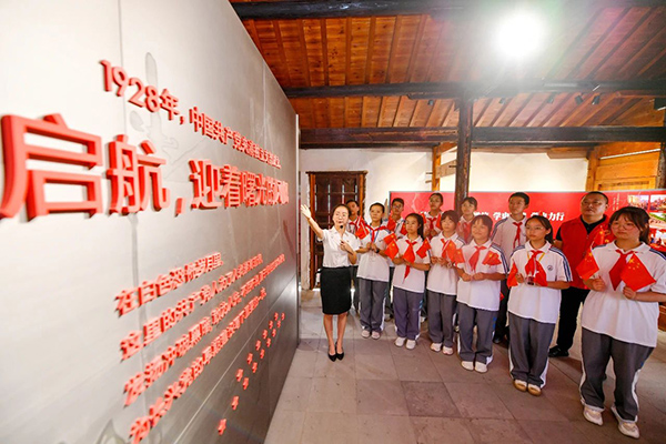 位于浙江省湖州市长兴县夹浦镇滨湖村的张玉帆烈士纪念馆,来自夹浦镇中学的少先队员们正在聆听红色故事。来源:cfp