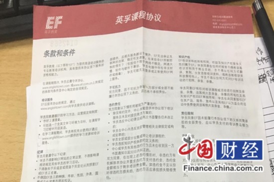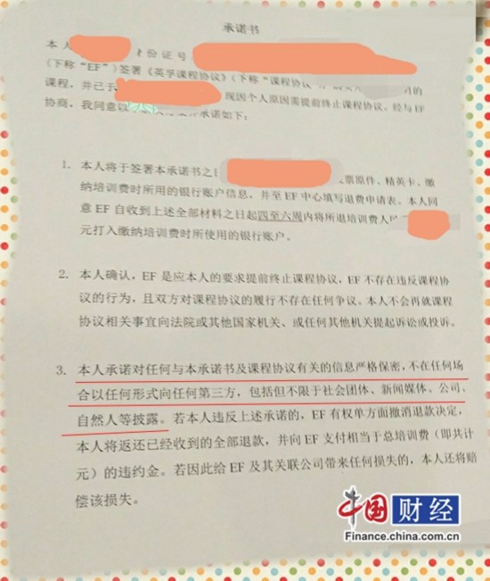不签“承诺书”不给退款?近日,刘女士致电中国网财经,称因不满意培训机构EF英孚教育课程质量,要求其退款,对方则提出“扣除4个月课程费和10%违约金”以及要求刘女士签署一份“不对外说退款一事”的承诺书,否则不予退款。刘女士认为,EF英孚教育提出的条件属于“霸王条款”。